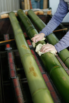 The green bamboo is loaded onto trucks and transported to the head office, where it is placed upside down to remove the moisture contained in the bamboo.