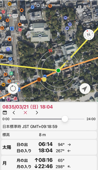 アプリを使って、空海が入定した835年の春分と、1200年後の2025年の春分の住吉大社の日の入ラインを計測しました。日の出・日の入線を表すオレンジの線が、社殿から反橋を渡って海へと向かっています。