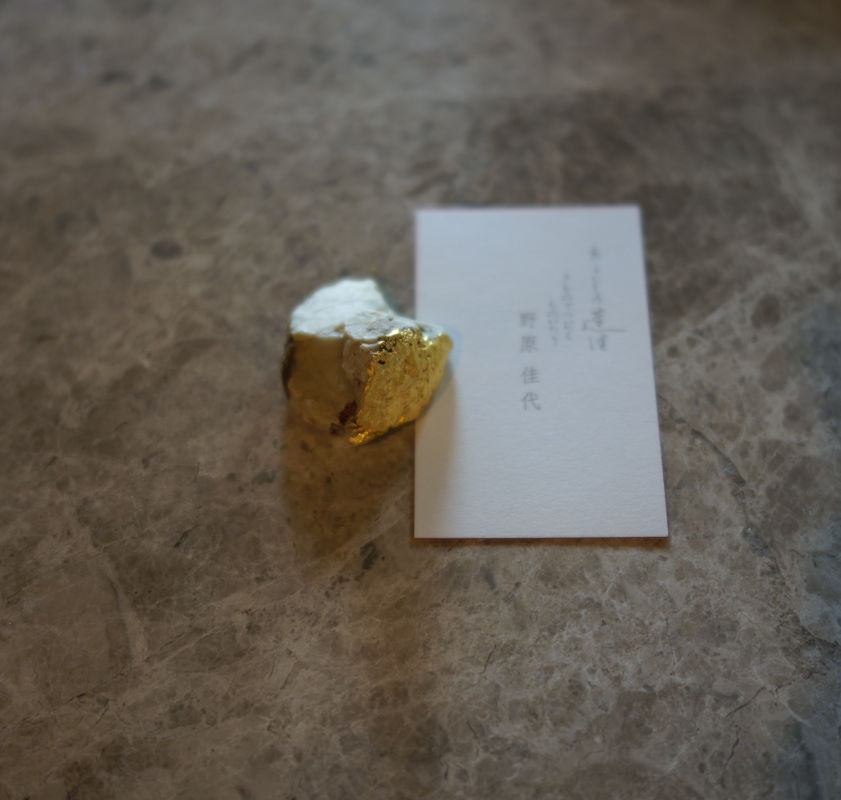 寺社仏閣の金の荘厳に使われる伝統技法「金箔押」で、小石に箔押を施したオリジナルのペーパーウェイトです。