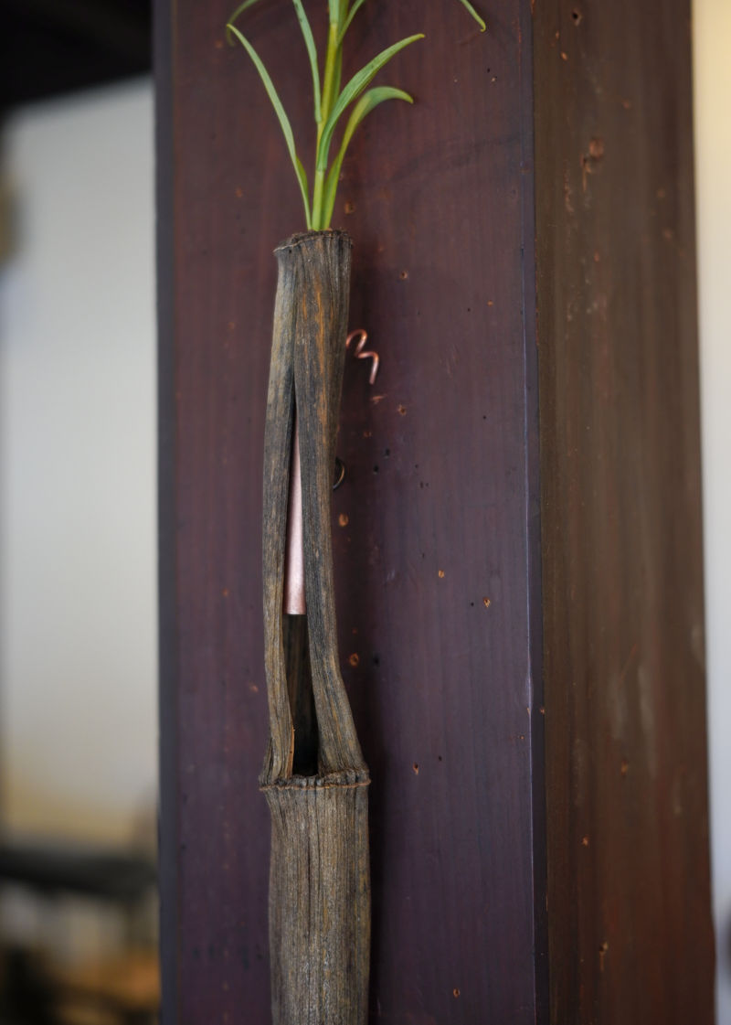 止り竹という、竹に成りきらずに成長を止めた筍を、花入に仕立てた品です。